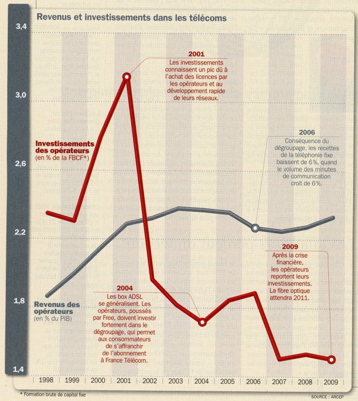 Au détour des lectures, ce graphique du n°247 de Challenges m’a sauté aux yeux. L’article intitulé « Pour l’Etat, voici ce qui légitime sa ponction sur les télécoms » est illustré d’une courbe que je me risque à reproduire ici. Elle met en relation l’évolution des revenus des opérateurs et le montant de leurs investissements. Le texte signale que « le montant des investissements en télécommunications réalisés par les opérateurs en 2009 atteint 5,9 milliards d’euros » selon l’Arcep, « soit une baisse de 9,6% par rapport à 2008. La figure montre clairement à quel point désormais les opérateurs privés de notre pays sont dans une phase que l’on pourrait qualifier d’intense exploitation de la mine du cuivre et de l’ADSL. A quel point également, à cette heure, les investissements d’avenir n’ont jamais aussi bien portés leurs noms… Ils restent à lancer !