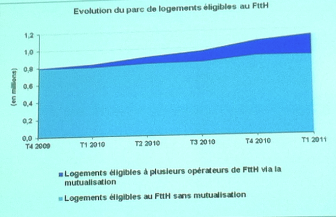 Cela ne se traduit pas encore vraiment en termes de logements raccordables en Ftth. Ceux-ci ne sont passés que de 840.000 en mars 2010 à 1.136.000 en mars 2011 (+35,9%). Le nombre d’abonnés Ftth est lui passé de 81.000 en mars 2010 à 140.000 un an après.