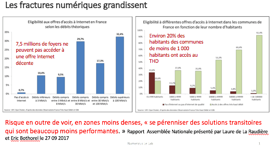 L’actualité ménage parfois des coïncidences intéressantes. Deux publications ont en effet été récemment proposées sur les interrogations au centre de l’atelier. La première est un travail du 26 septembre 2017 produit par l’association Que Choisir. La seconde prend la forme d’un rapport de l’Assemblée Nationale sur la couverture numérique du territoire présenté par Laure de La Raudière et Eric Bothorel le 27 septembre 2017. Toutes deux confirment ce que nombre d’autres rapports ou analyses avaient déjà mis en évidence. Les fractures numériques entre métropoles, villes et espaces ruraux se creusent.