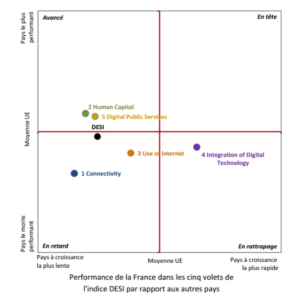 La Commission Européenne donne quelques indications pour répondre à cette interrogation. Elle a par exemple construit l’indice DESI (Digital Economy and Society Index). Ce dernier permet de comparer la situation numérique des pays d’Europe. Elle vient également de publier un « Rapport sur l’état d’avancement de l’Europe numérique » qui propose un document consacré à notre pays. Là encore, nous ne brillons guère. Parmi les 28 États membres de l’UE, la France se classe en effet seulement en 16e position. Pour la Commission, « la France appartient au groupe des pays obtenant des résultats moyens. » L’analyse de cette position est synthétisée dans la figure ci-dessous.