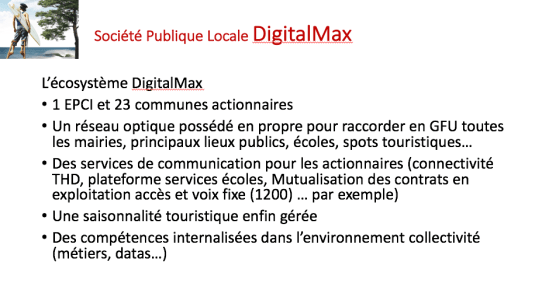 MACS figure parmi ces territoires pionniers qui ont décidé de prendre en main une partie de leur devenir numérique via la création de la Société Publique Locale (SPL) DigitalMax. Les investissements numériques brièvement rappelés ci-dessous lui permettent désormais non seulement de maîtriser ses stratégies services mais aussi de gérer les carences des opérateurs du marché. DigitalMax intervient par exemple pour assurer un service numérique de qualité pendant la saison touristique qui voit le territoire passer d’environ 60 000 habitants à plus de 300 000 usagers.