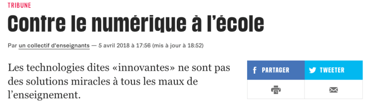 « Toutes ces promesses de renouvellement pédagogique par les technologies innovantes relèvent, en réalité, d’un renoncement à la pédagogie. Quand on nous oppose qu’il faudrait vivre avec son temps, nous pensons précisément qu’il est urgent de prendre quelque distance avec une époque affectée d’une boulimie consumériste et technologique aux effets catastrophiques, tant socialement qu’écologiquement. » Face aux excès en tous genres des grandes plateformes, dont les erreurs de Facebook ne sont que la dernière illustration, comment ne pas partager leurs craintes ?