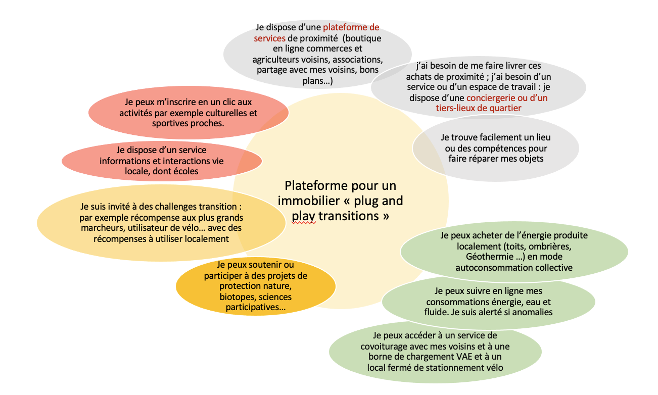 Pour tester la piste Web transitions, l’ambition des projets prototypés, et dans un cas en phase de lancement, consiste à aller plus loin en inventant cet habitat « plug and play transitions ». La solution correspond à celle esquissée précédemment : elle consiste à augmenter les fonctions offertes par les bâtiments dans lesquels on vit ou on travaille (protection, chaleur, fraîcheur, énergie, eau…) par un autre service désormais aussi important : décarboner, relocaliser, s’adapter, mutualiser… Le but est de fournir à chaque résident une solution simple pour qu’il dispose, dès le premier jour de la prise de possession des locaux, d’une plateforme de services comme celle synthétisée dans la figure qui suit.